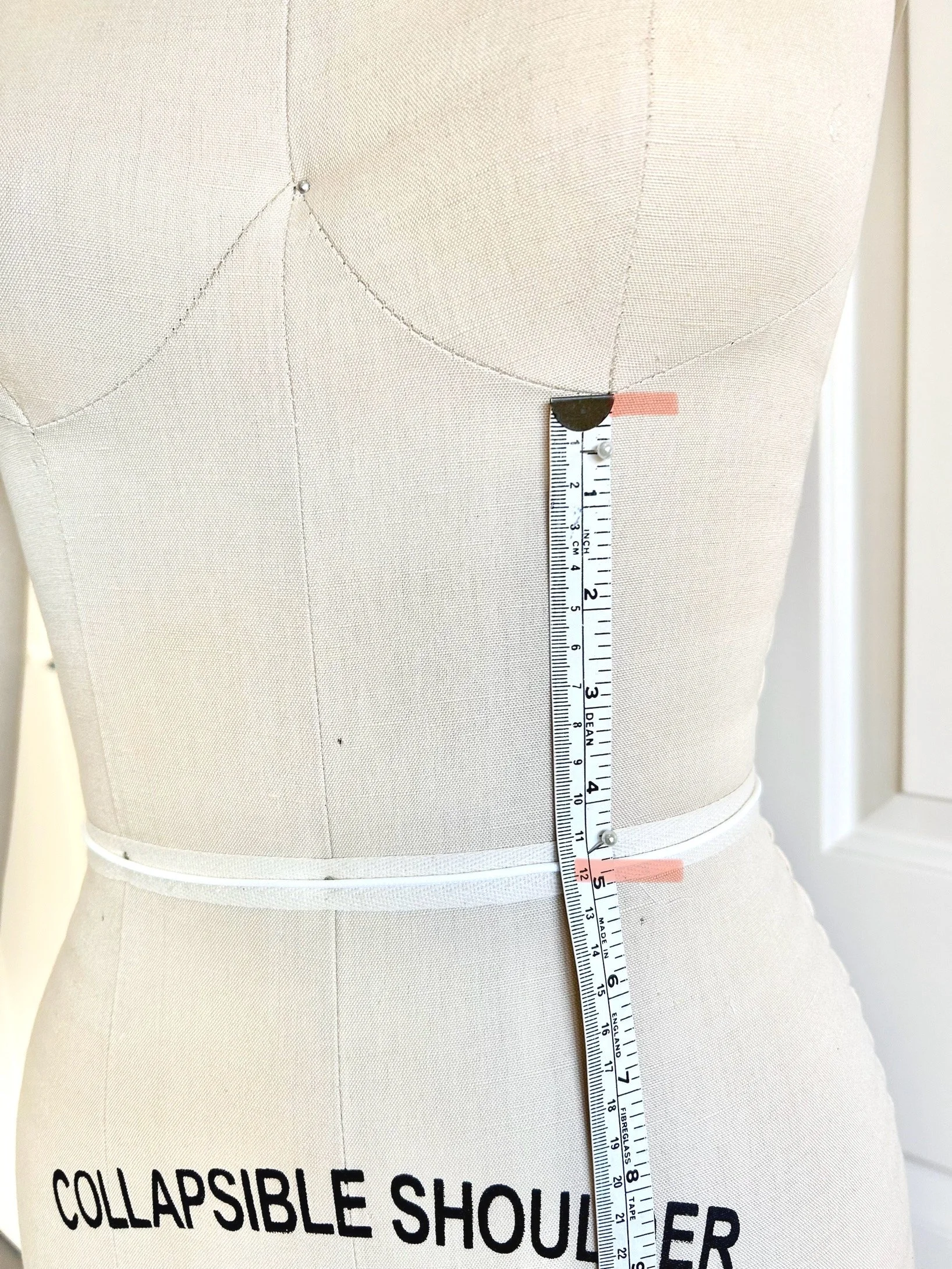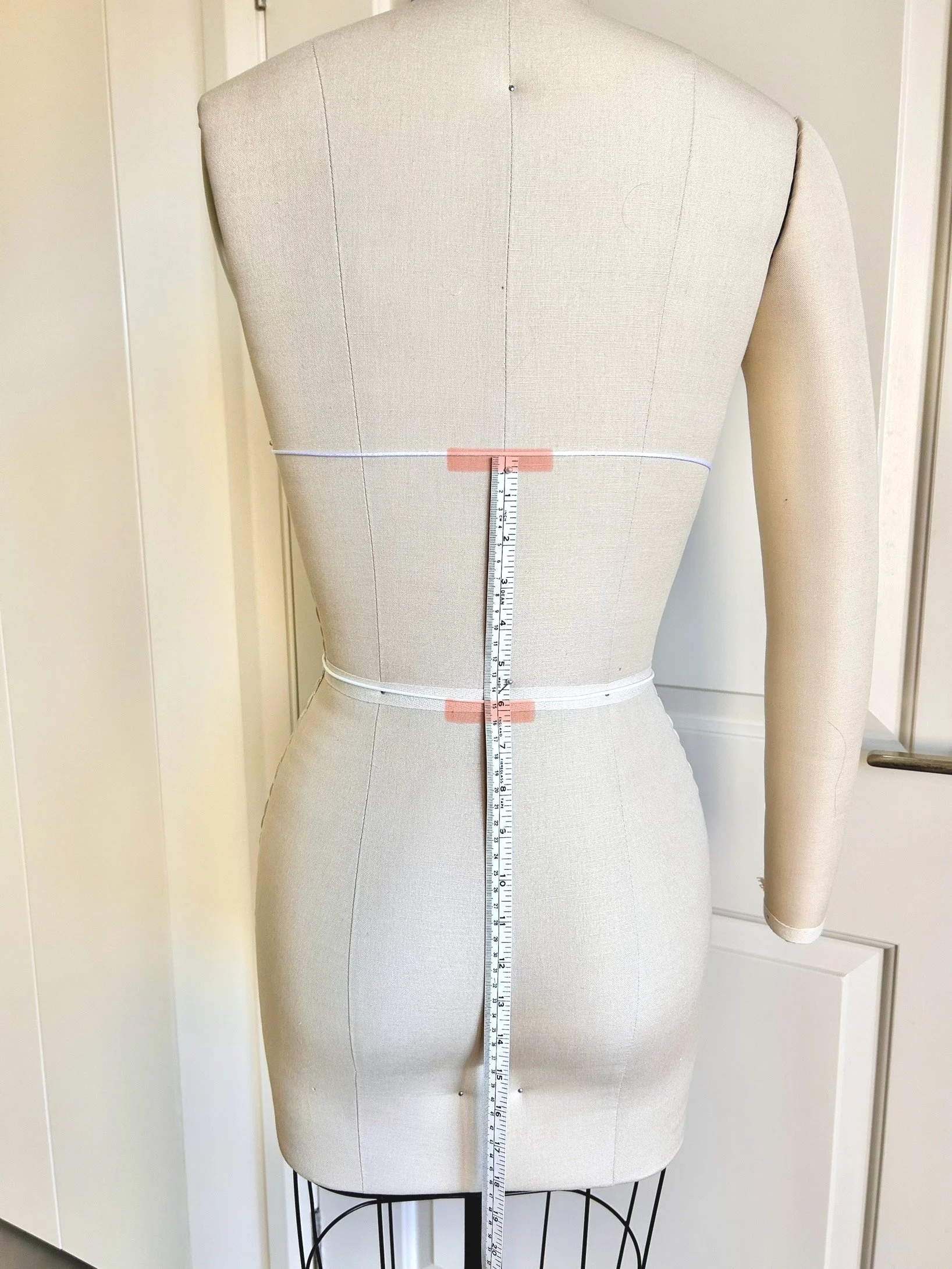 Measure vertically the distance between the waistline and bust/chest line at the centre back of the torso. Use the bottom of your bra/crop top if you are wearing one as a guideline. For people with very straight posture, this measurement should be the same or very similar to the bust/chest line to waistline measurement when you have just taken at the front. For those who have a curved spine and anterior hip tilt (i.e. ‘banana back’ posture) this measurement will be shorter. This is also known as being ‘short-waisted’, and is very common
