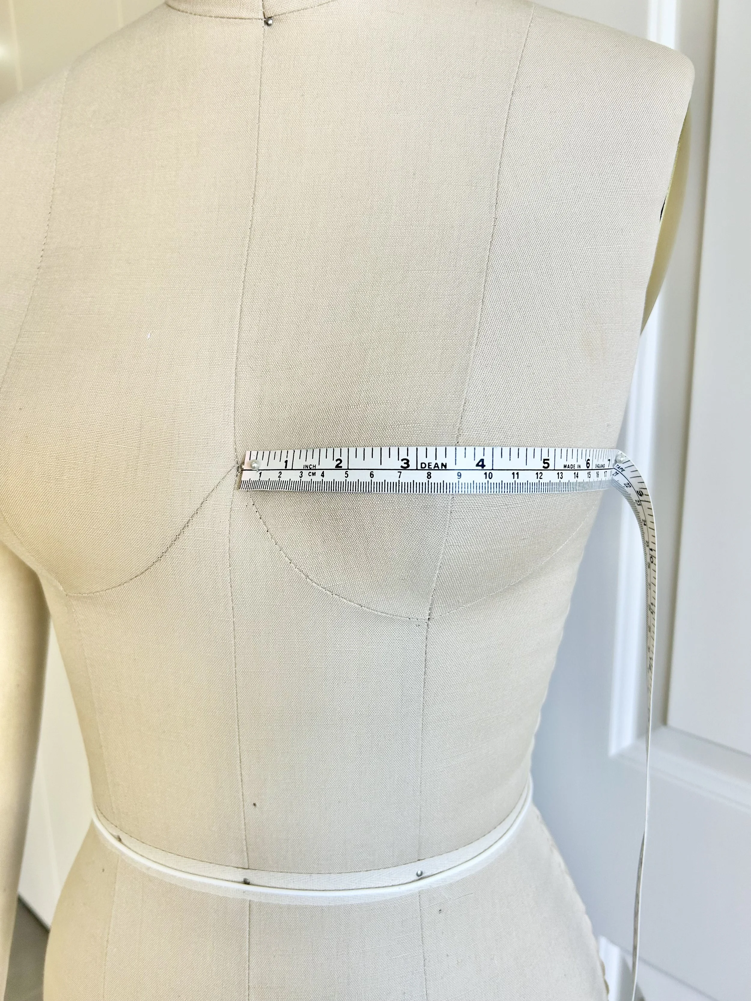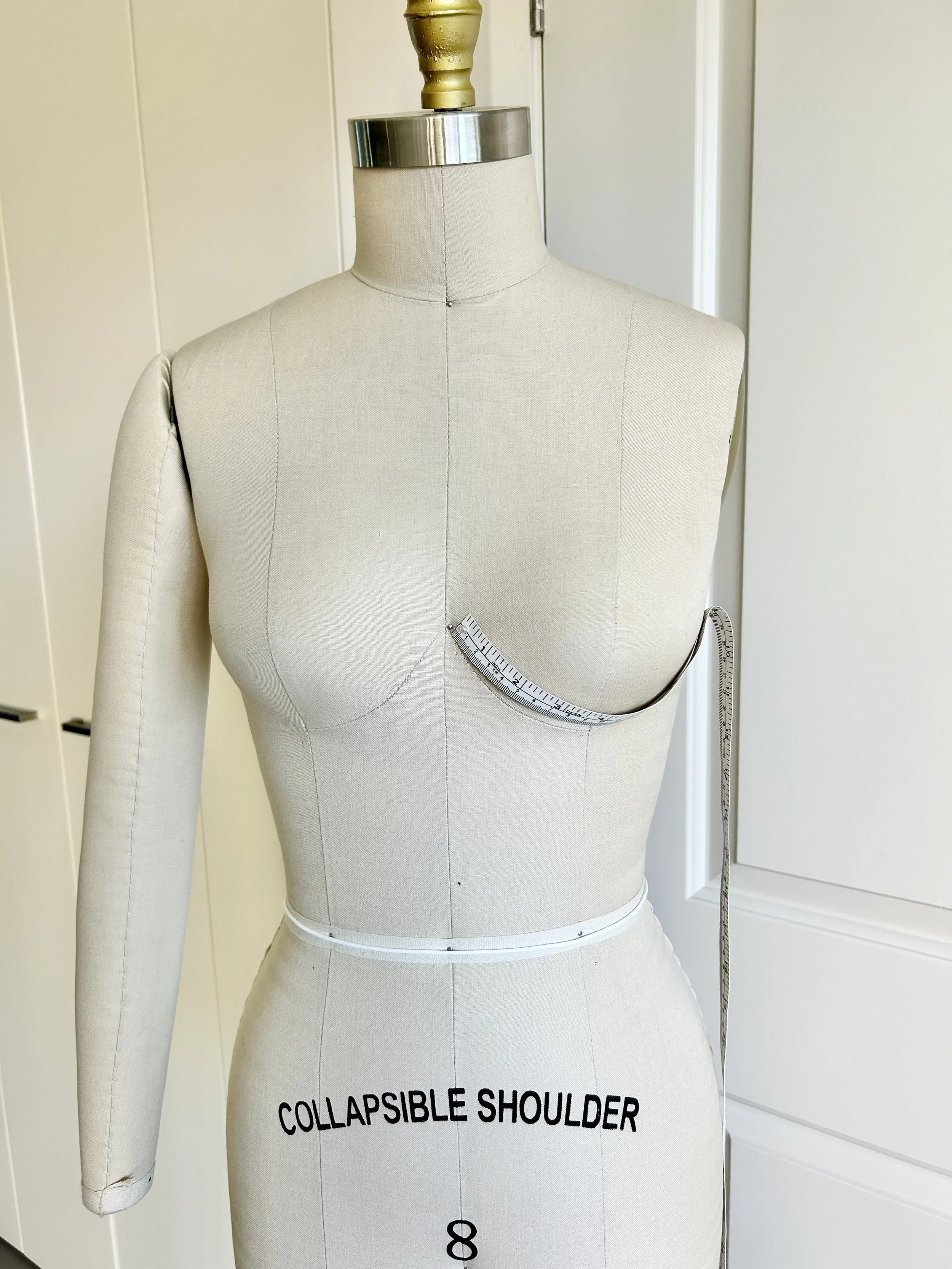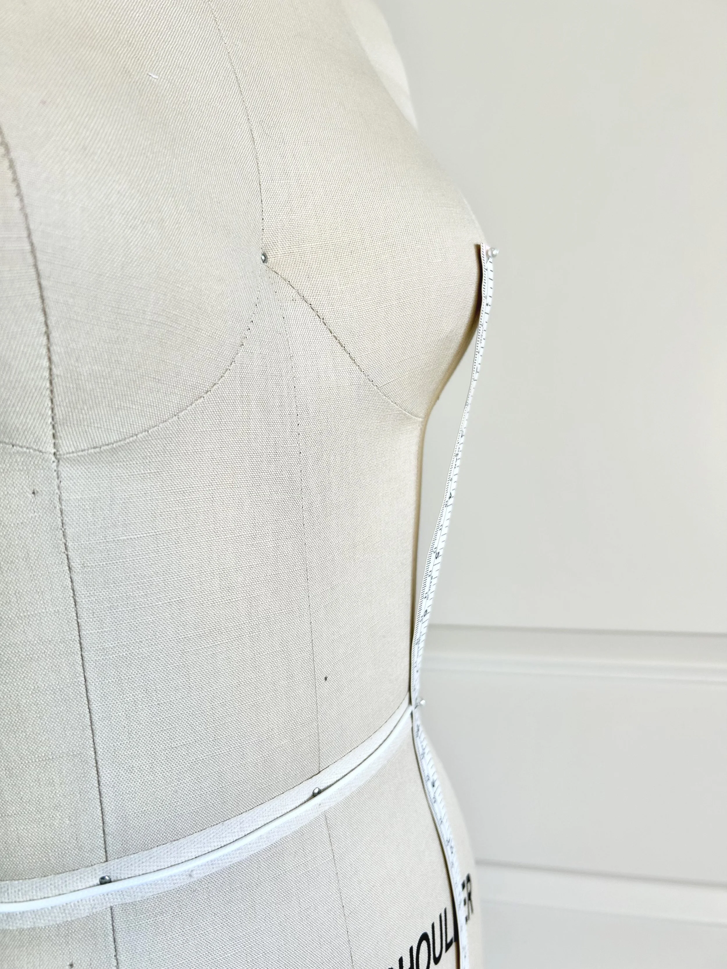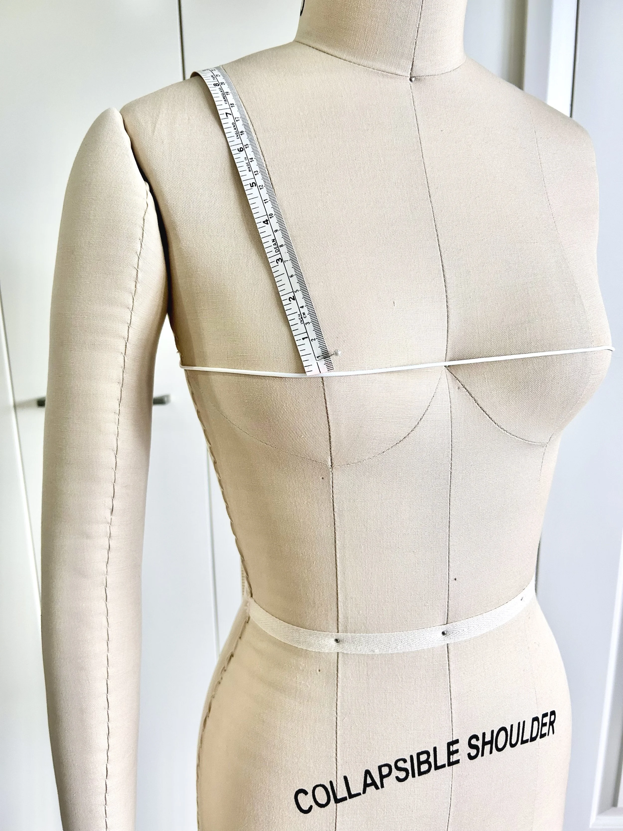Following the curve of the shoulder, measure the distance between the bust/chest line (the bust apex) at the front of the torso, over the shoulder to the bust/chest line at the back of the torso