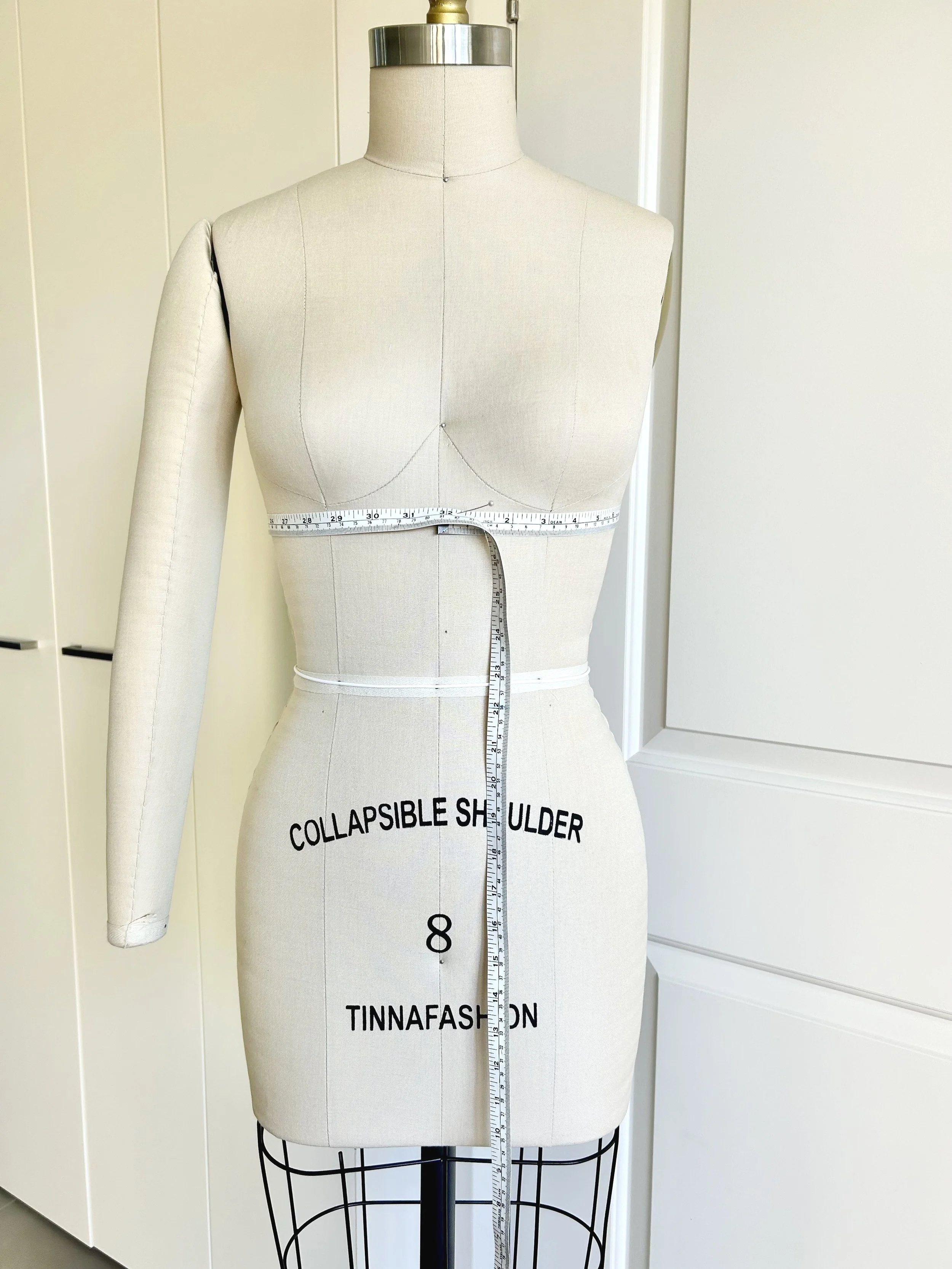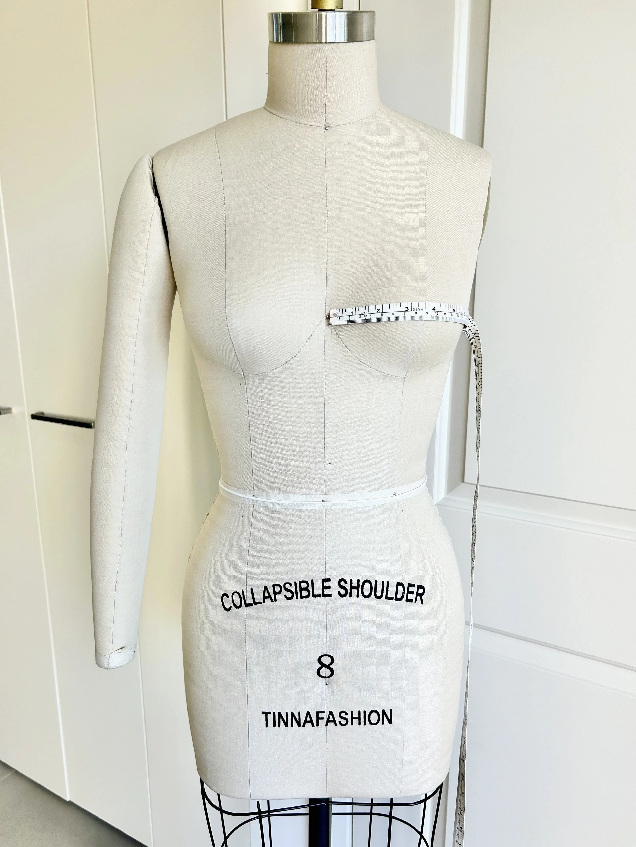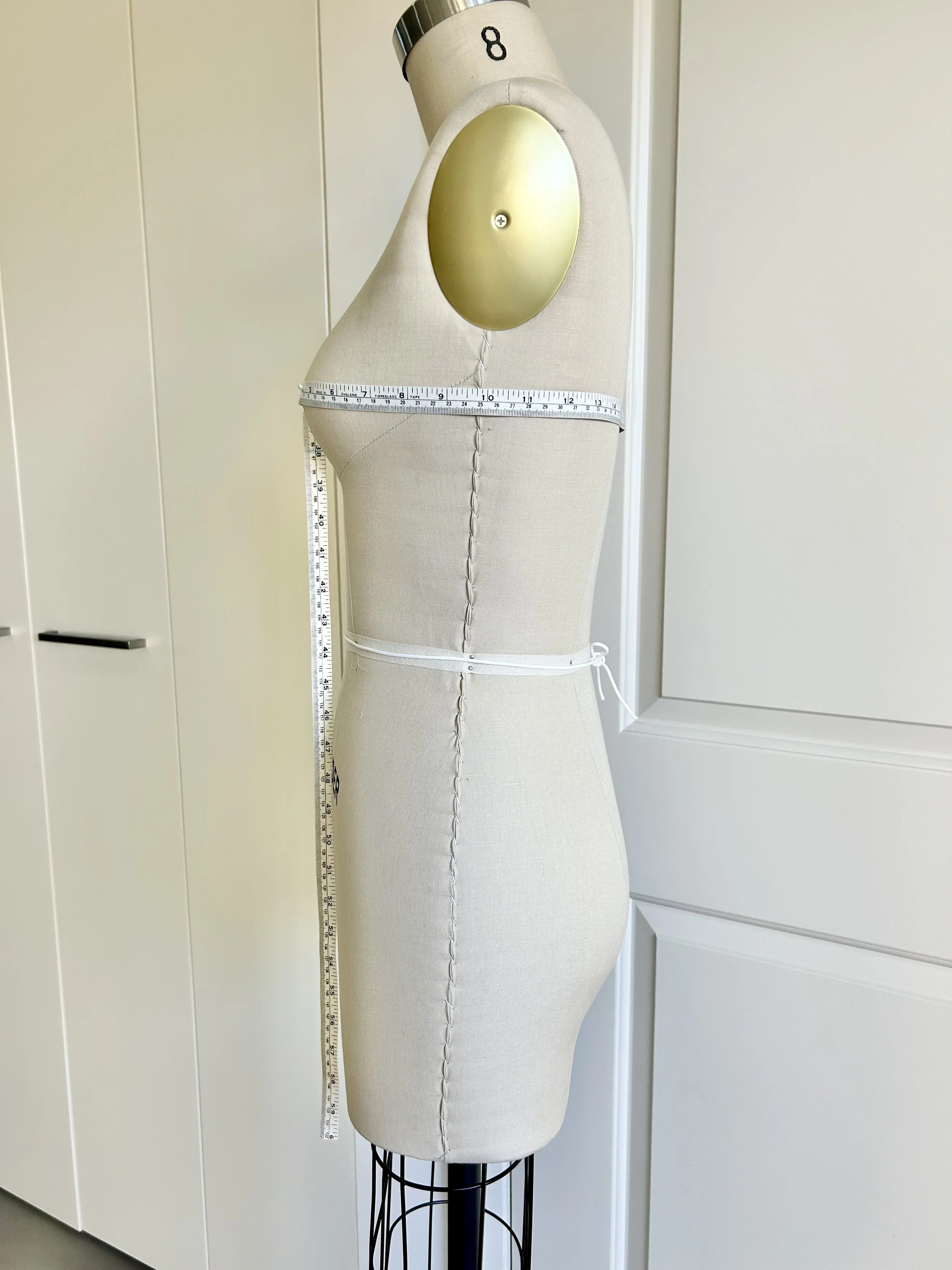 Following the curve of the shoulder, measure the distance between the bust/chest line (the bust apex) at the front of the torso, over the shoulder to the bust/chest line at the back of the torso