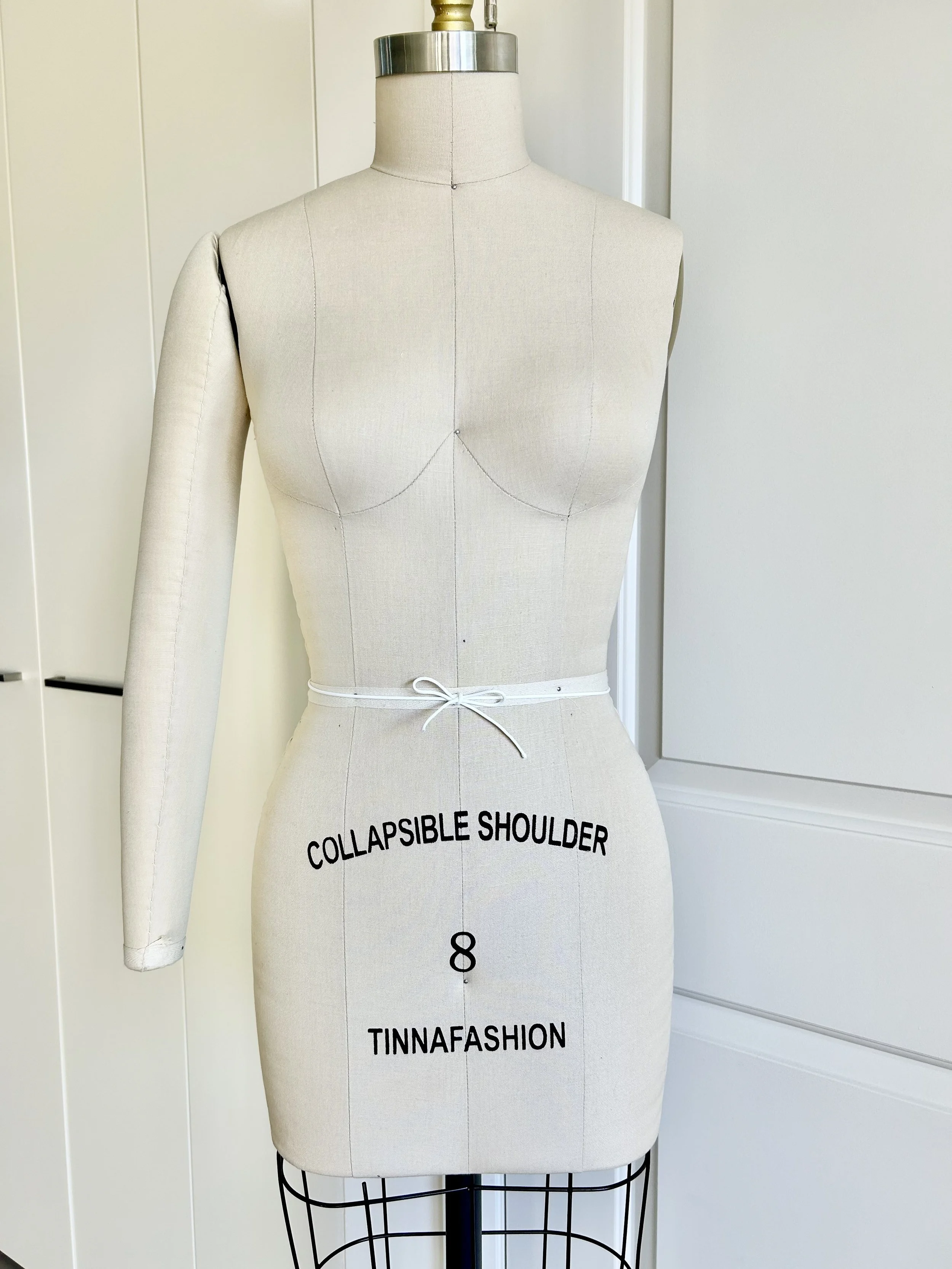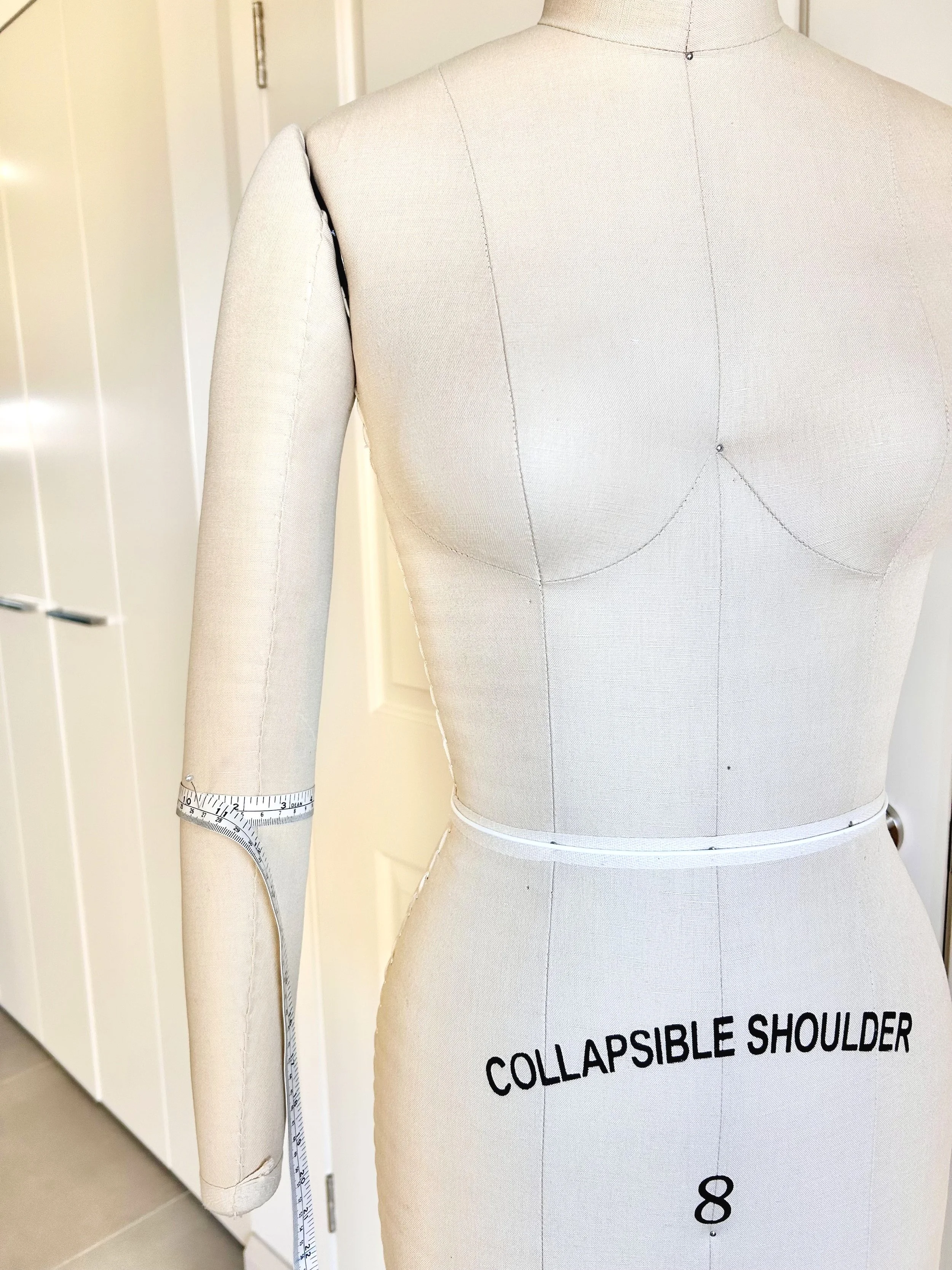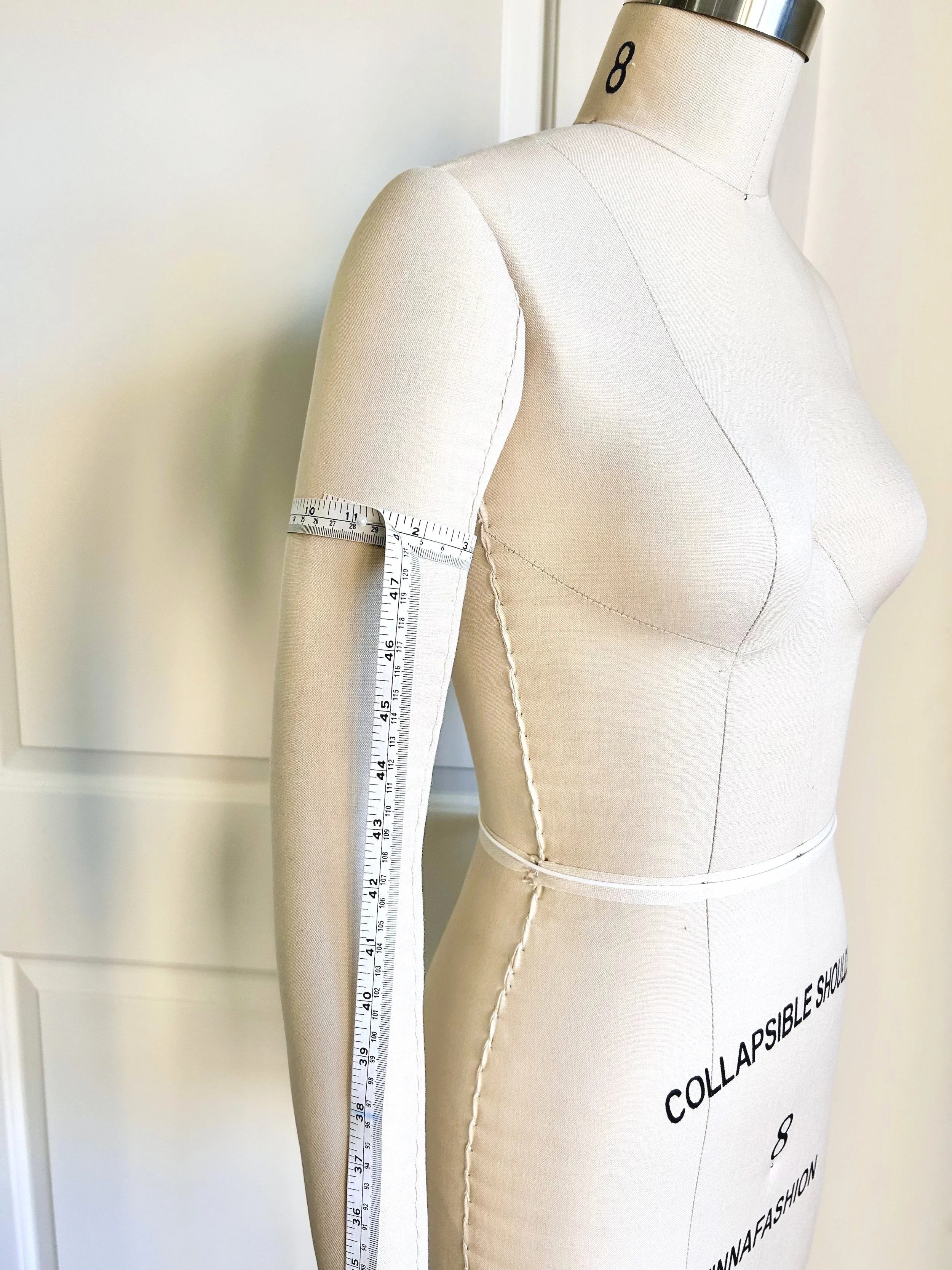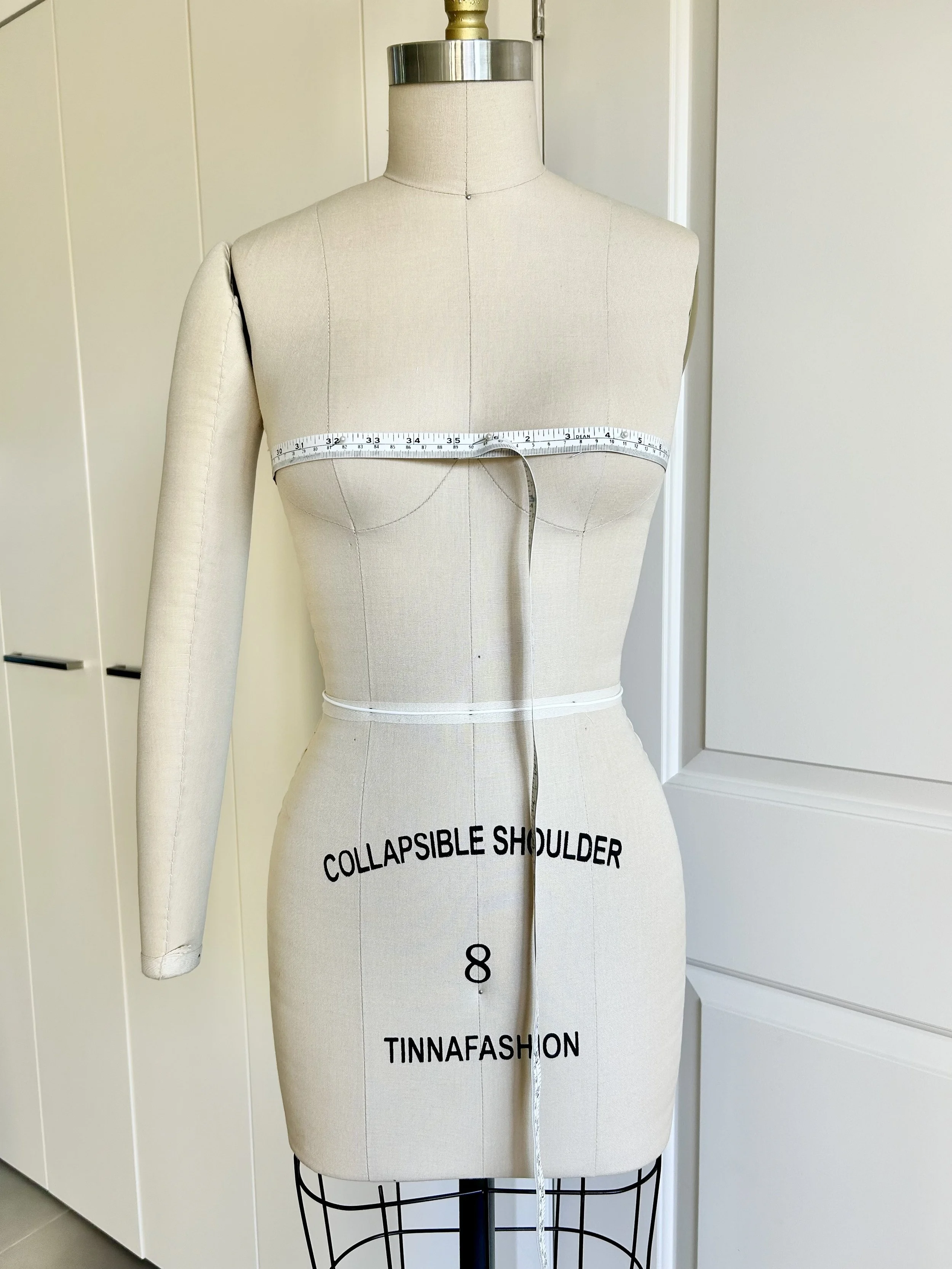 Following the curve of the shoulder, measure the distance between the bust/chest line (the bust apex) at the front of the torso, over the shoulder to the bust/chest line at the back of the torso