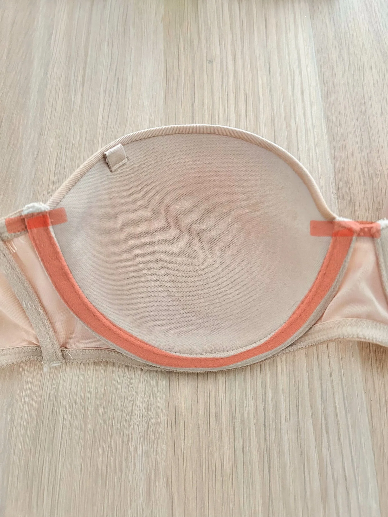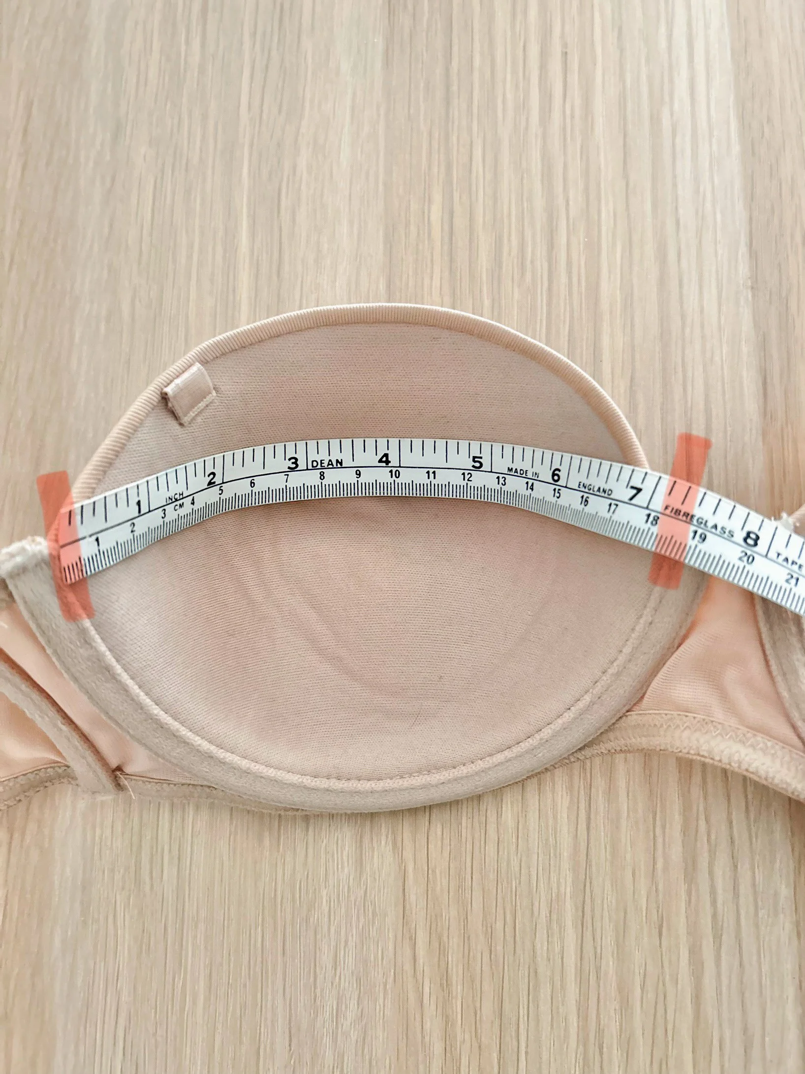 Measure horizontally over the curve of one breast across the widest point, from where it curves out from the body at the centre of the chest to where it curves in at the side under the armpit. Alternatively, you can take a non-padded bra that fits you really well, and measure the internal width of the cup from side edge point to side edge point. I highly recommend taking both measurements for maximum accuracy
